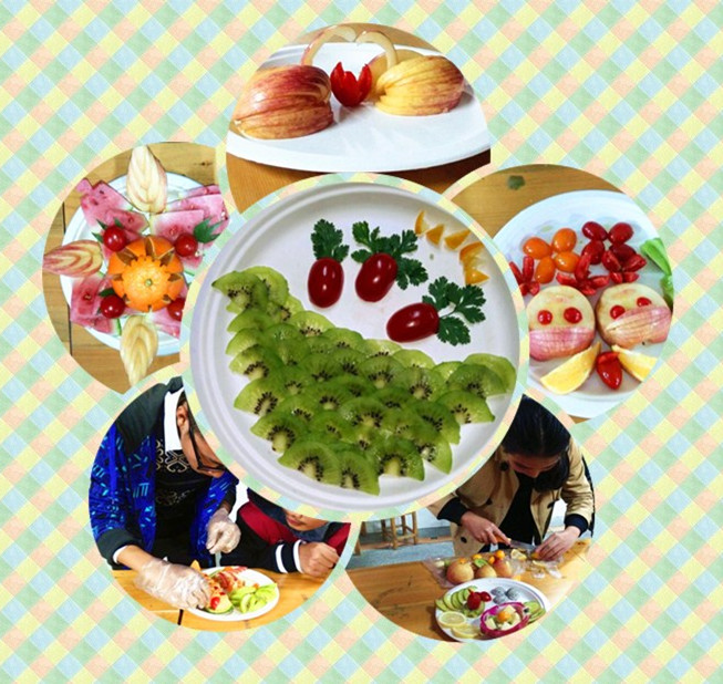 18:30比赛开始。选手们拿出事先准备好的食材,进行“水果拼盘”大比拼。随着主持人的一声令下,8位选手迅速投入到激烈的比赛中。来自14级大类(4)班的范雅丽以她娴熟的刀工迅速将又甜又大的西瓜变成了一件艺术品。紧接着,她又给大家呈现了一个漂亮的橙子伞,美幻简约,为整个作品起到了画龙点睛的作用。同时,她把自己的作品取名为回归的“巢”,希望在人生路上不管走多远,都能在心里有属于自己的巢——家,常回家看看。火龙果、柠檬、圣女果、猕猴桃等颜色各异的水果在14级大类(2)班的杨欣雨手中变得活灵活现,“小家伙们”一上一下欢快地跳跃着,或是“手拉手”,或是“背靠背”,不一会儿一盘名为《色彩大爆炸》水果拼盘就完成了。同样拥有惊人刀法的赵昱则把苹果雕成一个个美丽的雕花,摆在盘子中间的四个方向,让人看着美观大方。在解说中他告诉大家,自己一直想去海南,去看看那里热带风景、金色沙滩,所以他把作品取名为海南风情。最后一位上场的动漫(1)班刘梦捷,她用香菜、圣女果、猕猴桃这三样简单的水果拼出了一条条可爱而自由的小金鱼。她说,希望自己像那些小鱼一样能够在自己的世界里自由遨游。比拼中,选手们大展身手,只见各种水果在他们手中经过刀切、雕刻、挖洞等一系列动作,变成了一个个美丽的饰品,再经过他们巧手搭配,一盘盘色香味俱全的美食拼盘就此大功告成。
