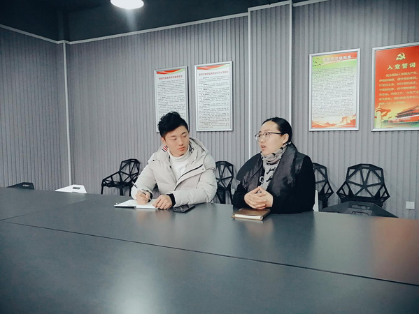 谈话中,2019级动漫制作技术一班张芮婷表示,班级同学学习主动性强,学习氛围融洽,但同学间交流不够。蒋璐璐建议她组织好主题团日活动,开展与专业相关的活动,增强班级凝聚力;调整工作方法,多与班级同学沟通,了解同学们的思想与心声。2019级动漫制作技术二班代丽娟表示,要坚定理想信念,加强自警自律,提高专业能力,积极工作带动同学共同进步。