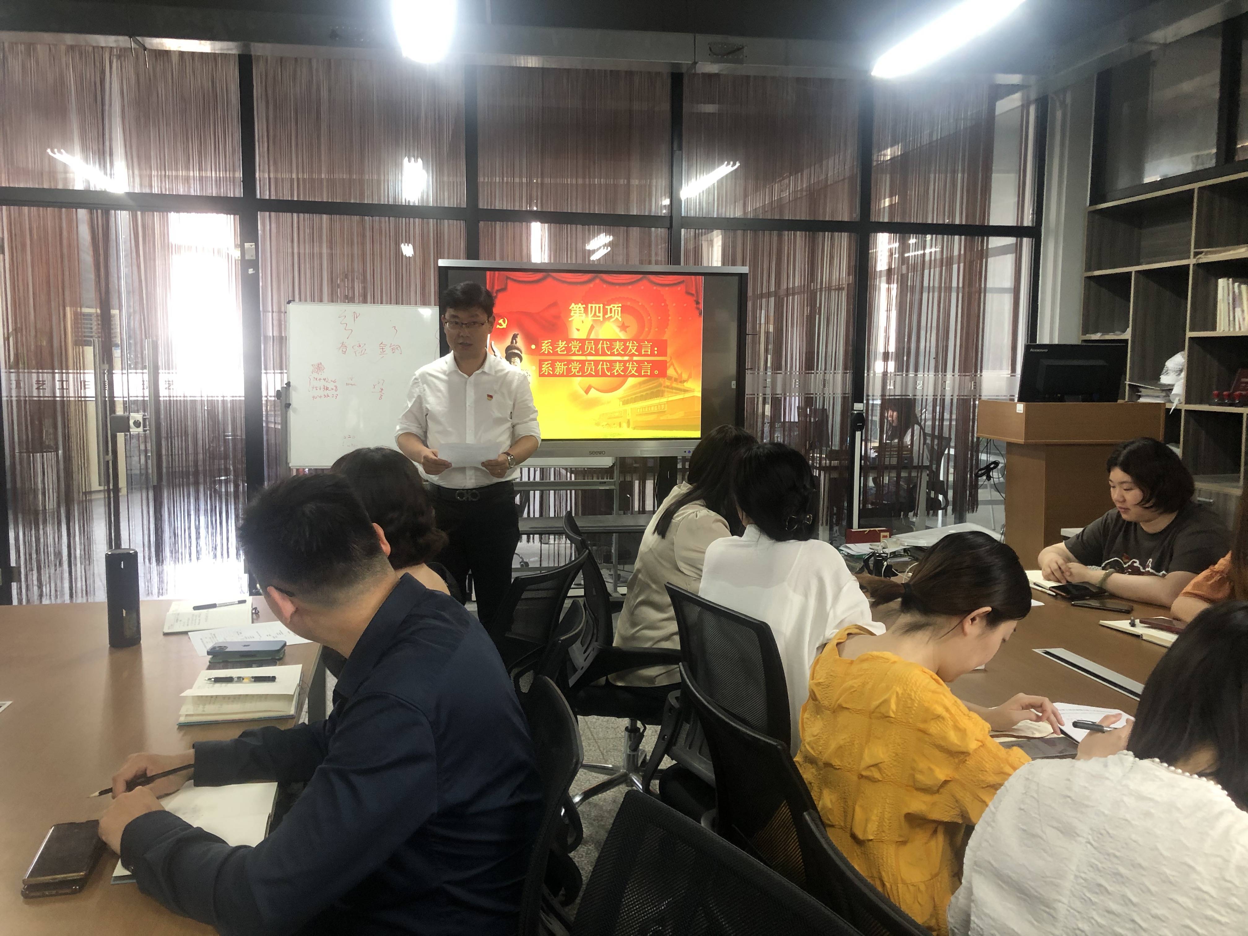 宣誓结束后,分别由系老党员代表、环艺教研室主任轩德军和系新党员代表、2020级动漫制作技术(1)班李文喆发言。轩德军表示:“共产党员的称号是光荣的,今天的承诺必须谨记于心、落实于行,希望新发展的党员同志可以带好头、今后的学习、工作中发挥先锋模范作用。”李文喆表示,自己作为预备党员代表发言非常荣幸,将本着全心全意为人民服务的宗旨,坚定政治信仰,做一名合格的党员。同时也将树立终身学习的观念,利用自己所学的科学文化知识更好的服务人民,奉献社会。